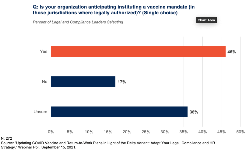 “While organizational leaders feel more confident in setting vaccine and testing policies in light of new developments, much of their original hesitancy about the drawbacks of such policies remain,” said Audet. “Legal and compliance leaders will need to think through the implications of assuming responsibility for employee health data with related administrative work, along with policies to limit confrontation and disruptions related to non-compliant employees.”