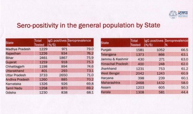 It has been pointed out that the Indian Council of Medical Research (ICMR) has conducted the recent National Sero-survey in 70 districts of India. The findings of this survey indicate the State-wise sero-prevalence as below: