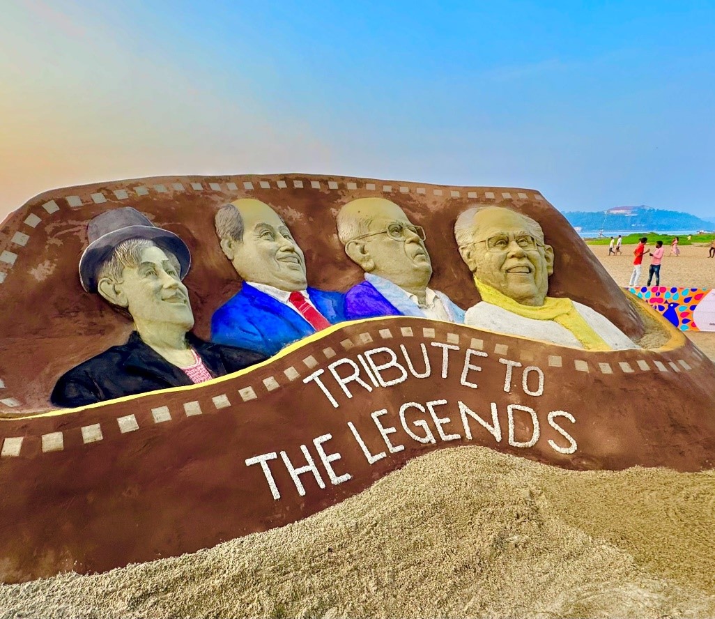 The installation, set against the beautiful backdrop of Miramar Beach, pays tribute to the immortal contributions of four cinema legends. Each of these icons shaped the Indian film and music industries, and this sand sculpture serves as a heartfelt homage to their timeless influence.