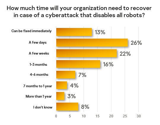 According to this study, most employees in companies with functioning production robots are aware of possible cybersecurity risks. Only 13% of them believe disabled robots can be fixed immediately in case of a cyberattack. More than half (52%) expect that recovery operations would take a few weeks or longer, and more the optimistic respondents (26%) are of the opinion that a return to normal production processes could happen within a few days.