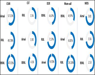 CSSR: Call Setup Success Rate (in %), CST: Call Setup Time (in seconds), DCR: Drop Call Rate (in %) & MOS: Mean Opinion Score.
