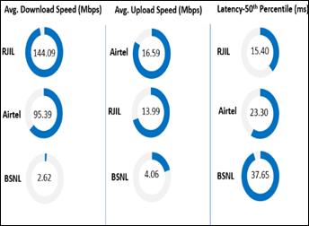 Summary-Data services Data Download performance (Overall): Average download speed of Airtel (5G/4G/2G) is 95.39 Mbps, BSNL (4G/3G/2G) is 2.62 Mbps and RJIL (5G/4G) is 144.09 Mbps. Data Upload performance (Overall): Average upload speed of Airtel (5G/4G/2G) is 16.59 Mbps, BSNL (4G/3G/2G) is 4.06 Mbps and RJIL (5G/4G) is 13.99 Mbps. Latency – 50th Percentile (Overall): Airtel – 23.30 ms BSNL – 37.65 ms RJIL – 15.40 ms Data performance – Hotspots (in Mbps): Airtel- 4G D/L: 37.08 4G U/L: 13.29 5G D/L: 152.00 5G U/L: 26.45 BSNL- 4G D/L: 2.29 4G U/L: 6.55 RJIL- 4G D/L: 15.53 4G U/L: 4.08 5G D/L: 275.60 5G U/L: 32.73 Note- “D/L” Download speed, “U/L” Upload speed |