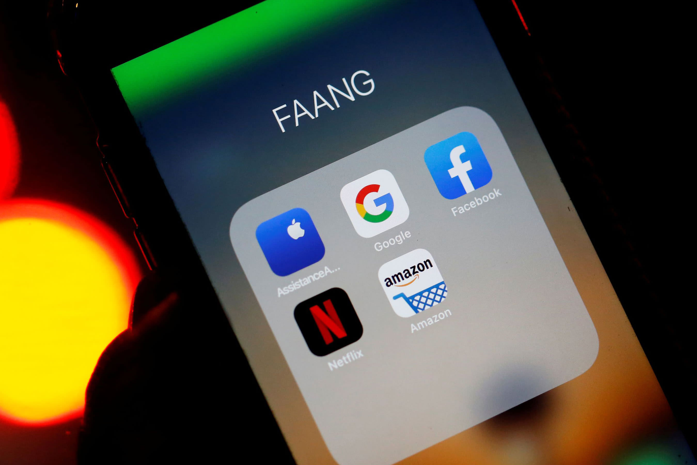 The logos of mobile apps, Google, Amazon, Facebook, Apple and Netflix, are displayed on a screen in this illustration.