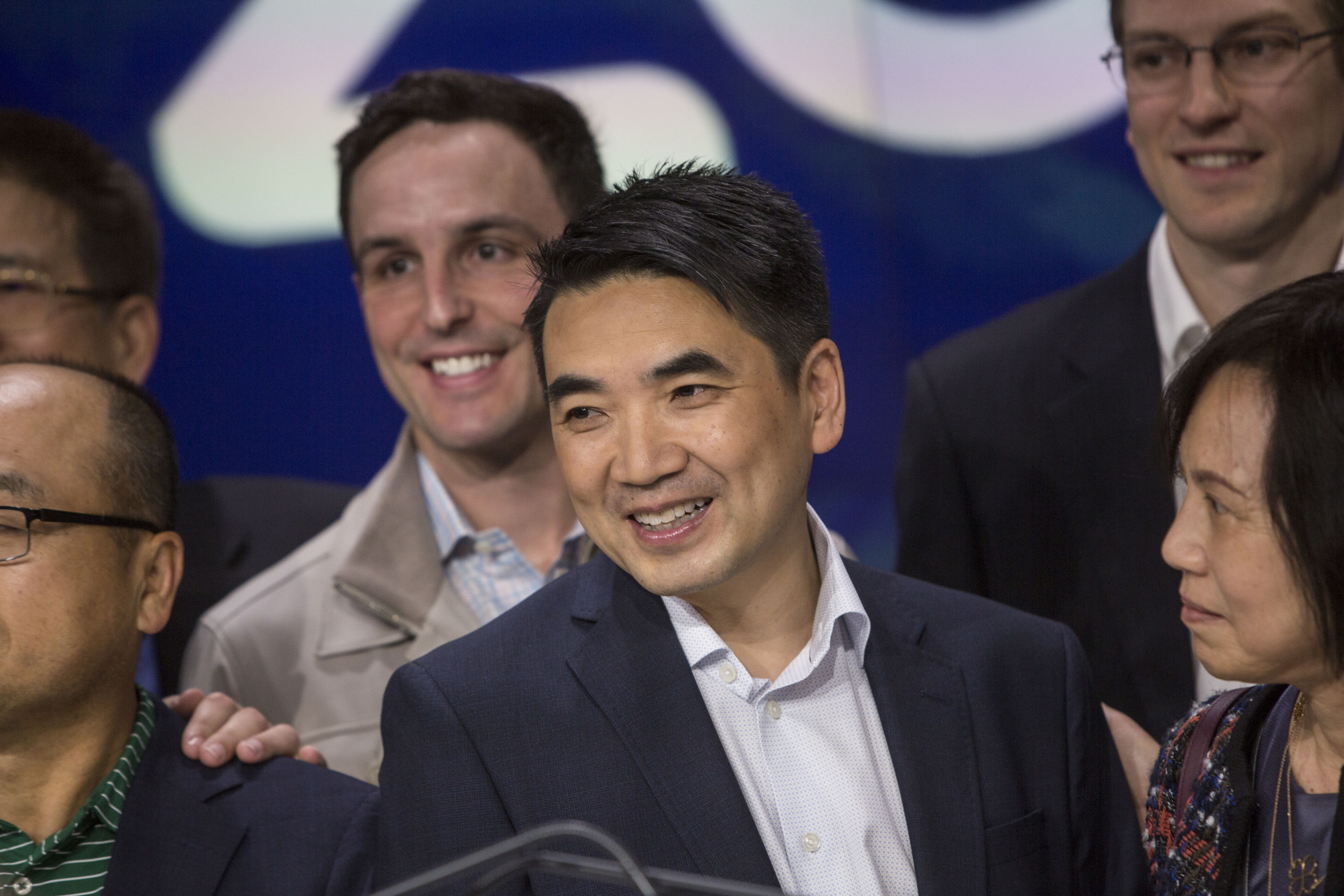 Eric Yuan, founder and chief executive officer of Zoom Video Communications Inc., center, rings the opening bell during the company’s initial public offering (IPO) at the Nasdaq MarketSite in New York, U.S., on Thursday, April 18, 2019. Zoom reported net income of $7.6 million on revenue of $331 million for the year ended January, and is now worth nine times the $1 billion valuation it secured after a funding round two years ago.