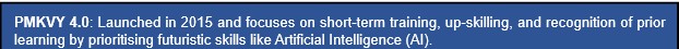 PMKVY 4.0: Launched in 2015 and focuses on short-term training, up-skilling, and recognition of prior learning by prioritising futuristic skills like Artificial Intelligence (AI).