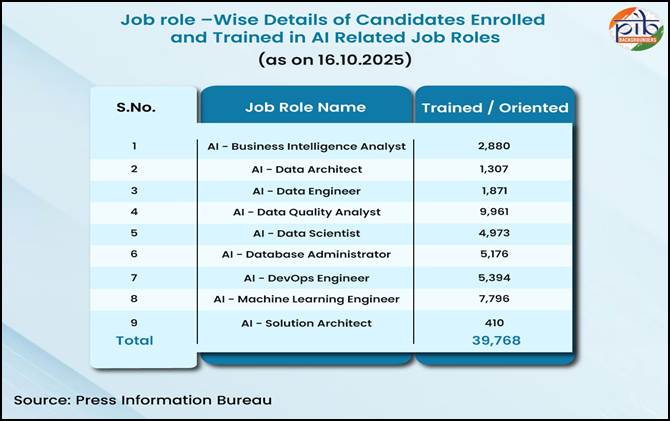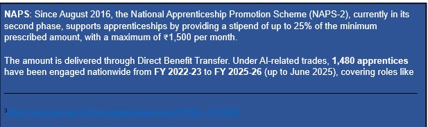 - As on June 2025 1,480 apprentices have been trained between FY 2022-23 to FY 2025-2026 in AI-related roles like AI Data Engineer and Machine Learning Engineer under NAPS-2.
