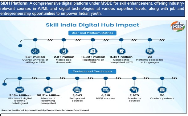 The Government of India is actively embedding AI and digital learning programs within the Skill India Mission (SIM) to prepare a future-ready workforce, with targeted initiatives under Pradhan Mantri Kaushal Vikas Yojana (PMKVY) 4.0, National Apprenticeship Promotion Scheme (NAPS), Industrial Training Institutes (ITIs) and National Skill Training Institutes (NSTIs)and the Skill India Digital Hub (SIDH) platform.