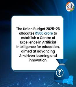 - The Union Budget 2025-26 allocates ₹500 crore to establish a Centre of Excellence in Artificial Intelligence for education, aimed at advancing AI-driven learning and innovation.