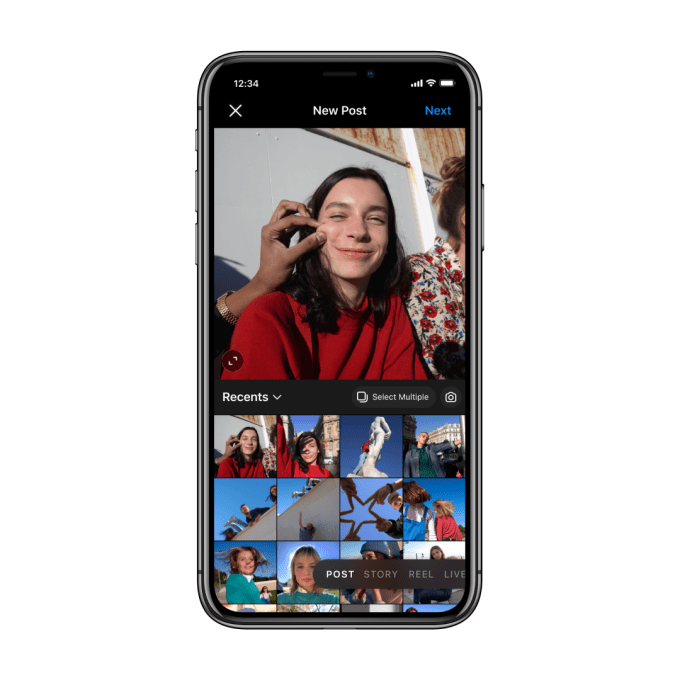 When tapped, the relocated Compose button will now take users to a redesigned Camera experience, too. Here, you can either pick photos or videos to post to your Feed, or scroll over to choose to post to your Story, Reels, or go Live. While this doesn’t replace the swipe gesture to get to the Camera, it does give all the different post formats a more equal footing.