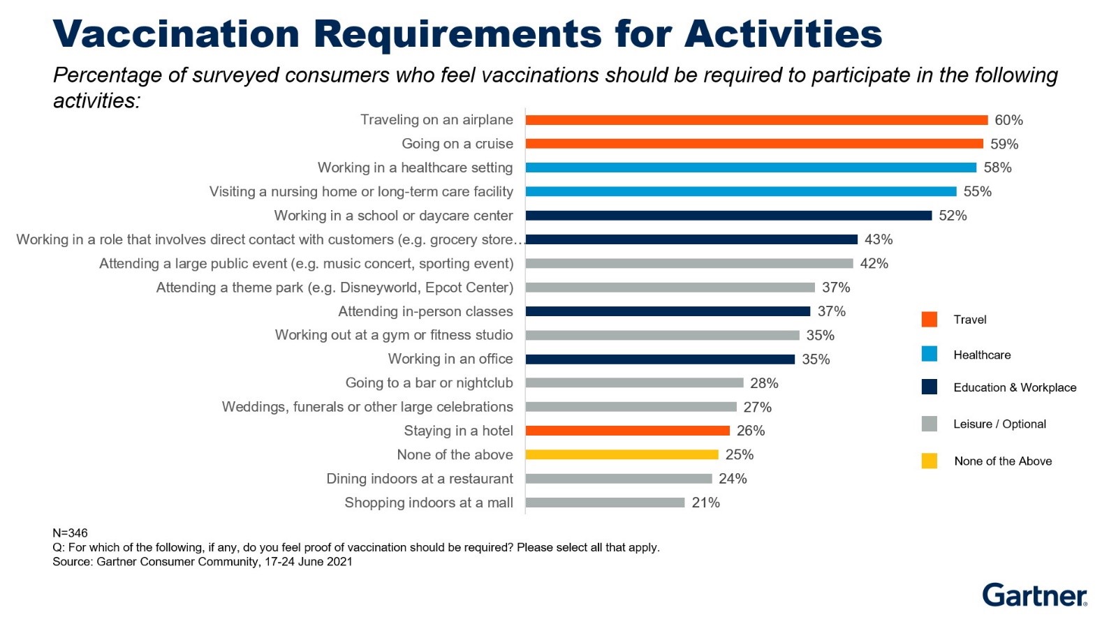 Organizations forming or revising in-person workplace policies face difficulties accounting for disparate attitudes to vaccination requirements, according to a recent survey by Gartner, Inc. In a June 2021 survey of 346 U.S. consumers, Gartner found that public attitudes to vaccine checks for entry vary depending on the setting.