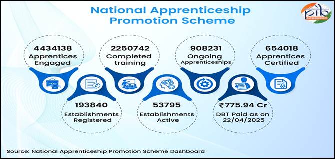 - As on June 2025 1,480 apprentices have been trained between FY 2022-23 to FY 2025-2026 in AI-related roles like AI Data Engineer and Machine Learning Engineer under NAPS-2.